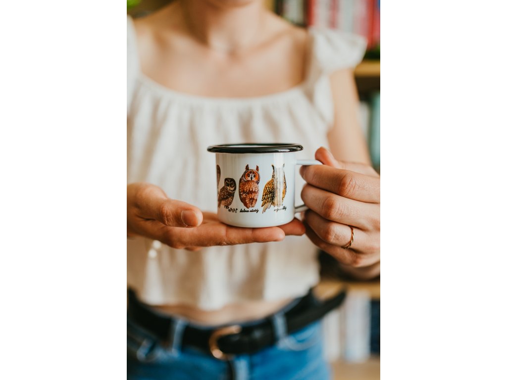 Smaltovaný hrneček neboli plecháček, který je zdobený černým lemem. Plecháček má potisk po celé ploše zhruba 2 cm od ucha a zdobí ho autorská ilustrace sov od ePiPí, která byla v originále malovaná akvarelem a pastelkami.