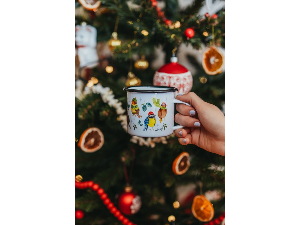 Smaltovaný hrneček neboli plecháček, který je zdobený černým lemem. Plecháček má potisk po celé ploše zhruba 2 cm od ucha a zdobí ho naše autorská ilustrace, která byla v originále malovaná akvarelem.