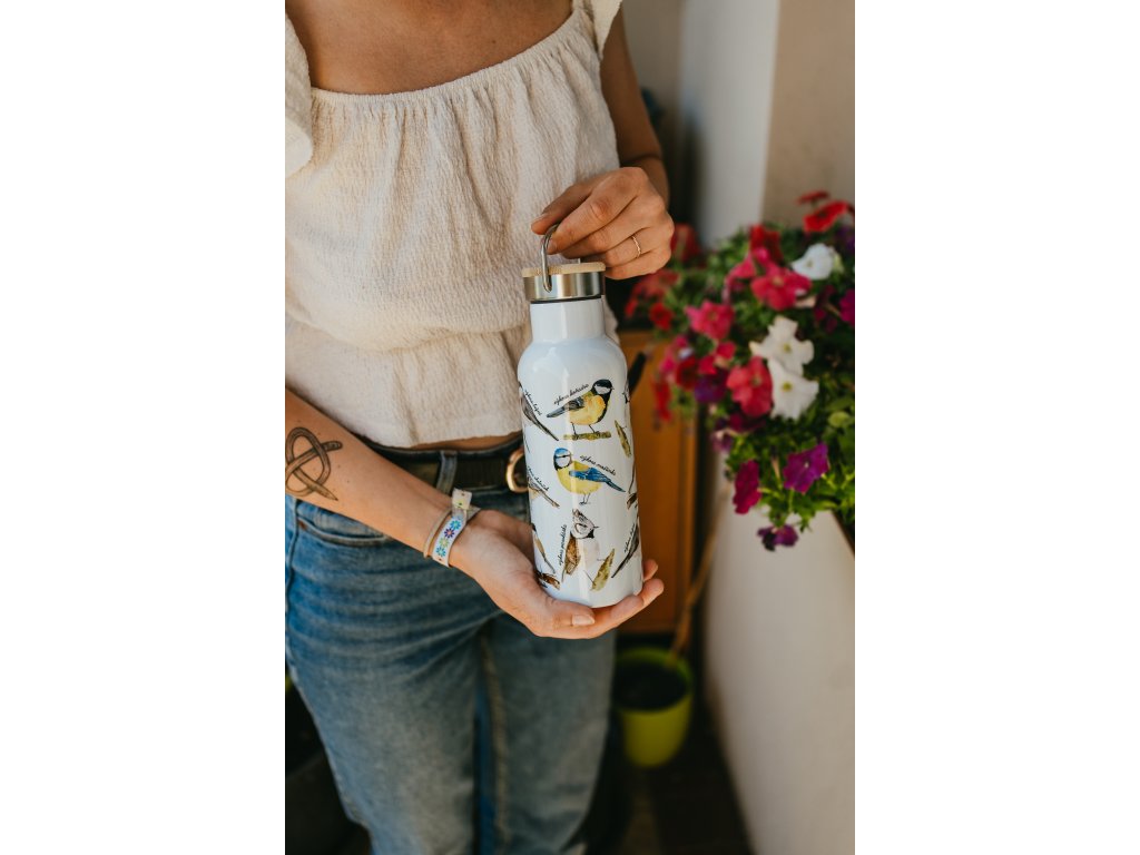 Termoska je potištěná naší autorskou ilustrací sýkorek, která byla v originále malovaná akvarelem a pastelkami. Potisk není 100% navazující - 1 cm má mezeru mezi začátkem a koncem potištěné plochy a je tvořený tak, že se na něm druhy ptáčků opakují. Konkrétně na něj přilétly sýkora modřinka, sýkora koňadra, sýkora parukářka, sýkora babka, sýkora uhelníček a sýkora lužní.