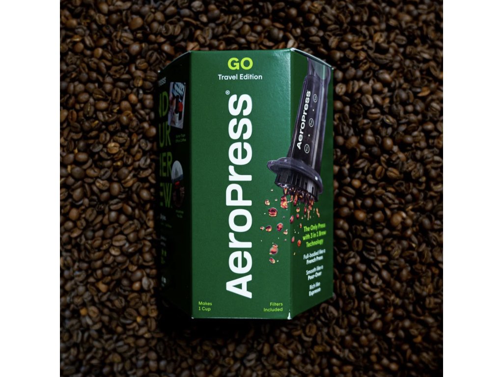 Aeropress Go je cestovní kompaktní verzí klasické verze. Balení obsahuje plastový hrnek, který funguje zároveň jako pouzdro, kam uschováte celý Aeropress. Míchadlo můžete složit a filtry ochráníte před zvlhnutím v plastové krabičče.