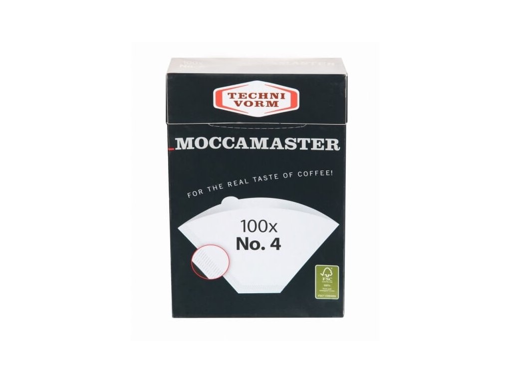 Bělené papírové filtry Moccamaster pro přípravu fantastické překapávané kávy. Balení obsahuje 100 ks. Velikost 4. Kompatibilní s Moccamaster KB, KBG, KBGT. Také je použijete do Cleveru Dripperu.